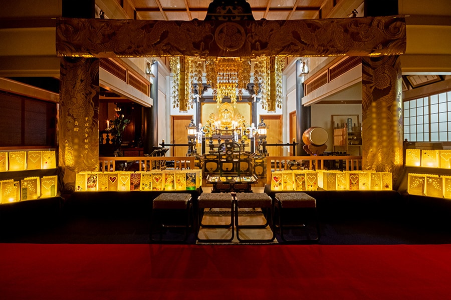 日が落ちてきた17時。照明を落とした本堂はランタンの温かい光で灯されます。