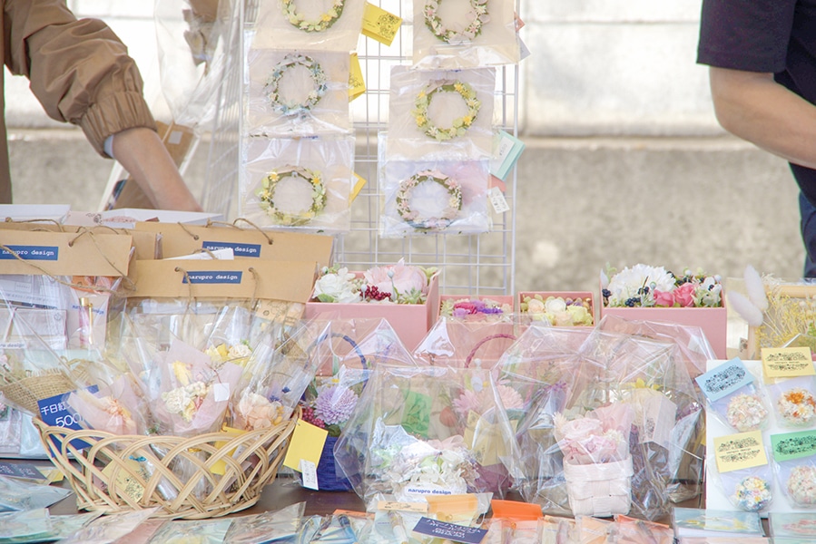お花見にぴったりなお弁当やお惣菜、人気のクレープなど美味しいグルメのほか、ハンドメイド小物の販売、ハズレなしの昆虫くじなど、賑わいを見せていました。