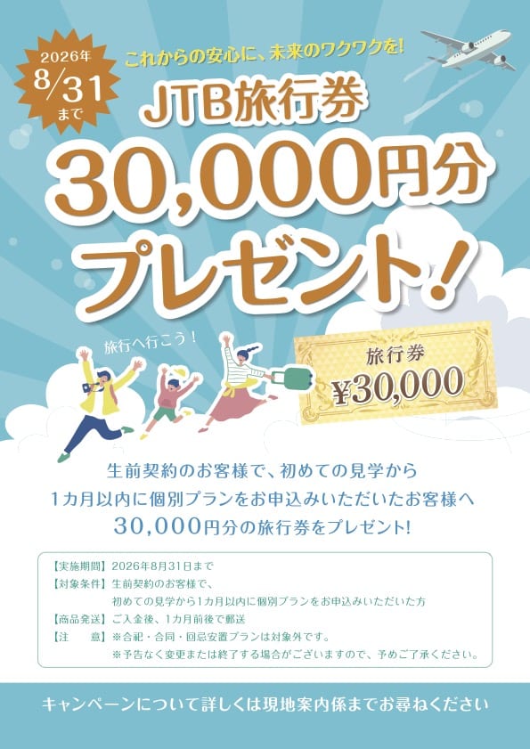 【生前契約特典】JTB旅行券3万円分をプレゼント中!