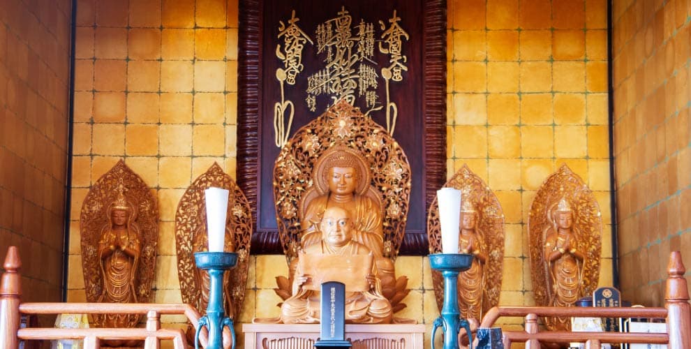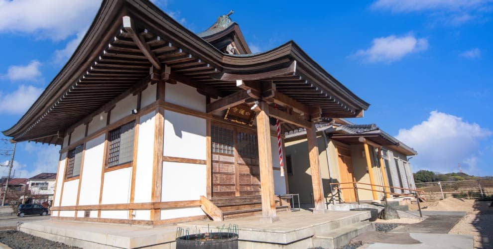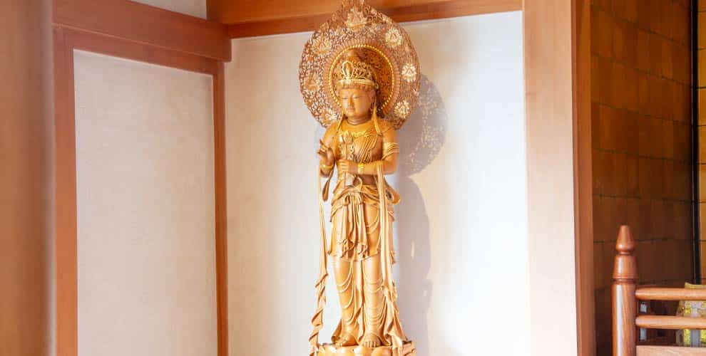 堂内には釈迦牟尼像をはじめ、四菩薩像、観世音菩薩像、鬼子母神像、日蓮聖人像が厳かに鎮座し、参詣する人々のさまざまな願いを温かく受け止めております。当寺は、葬儀や法事のみにとどまらず、古来よりお寺が担ってきた本来の役割を見つめ直し、人々の心の拠り所となる寺院であることを志しております。