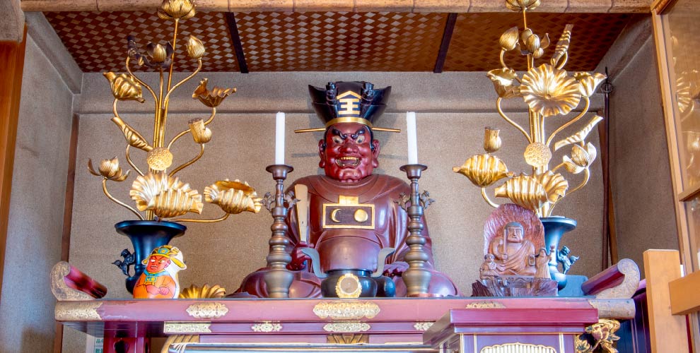 本尊は木造阿弥陀三尊像で、中尊は室町時代に造立された阿弥陀如来立像、両脇侍には安政2年(1855)に作られた観音菩薩立像および勢至菩薩立像が配されています。さらに本堂内には、元禄15年(1702)に造られた寄木造・彫眼の閻魔大王像(像高124.5センチメートル)が鎮座しており、歴史ある諸尊を今に伝えています。